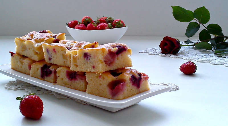 Ovocný koláč, príprava: Najskôr vyšľaháme vajcia a cukor. Potom pridáme všetky ostatné ingrediencie okrem ovocia a pekne spojíme. Olúpte jablko, nakrájajte ho na menšie kúsky, posypte krupicou a premiešajte, aby sa krupica nalepila na jablko. Použila som čerešne z mrazničky (v sezóne môžete použiť aj čerstvé). Keď krájate jablká, nakrájajte jahody na kúsky. Jablká vmiešajte do cesta a vylejte na plech vystlaný papierom na pečenie približne rozmerov 25 x 35 cm. Poukladajte čerešne a jahody. Ovocný koláč pečieme vo vyhriatej rúre na 180°C stupňov asi 40 minút.